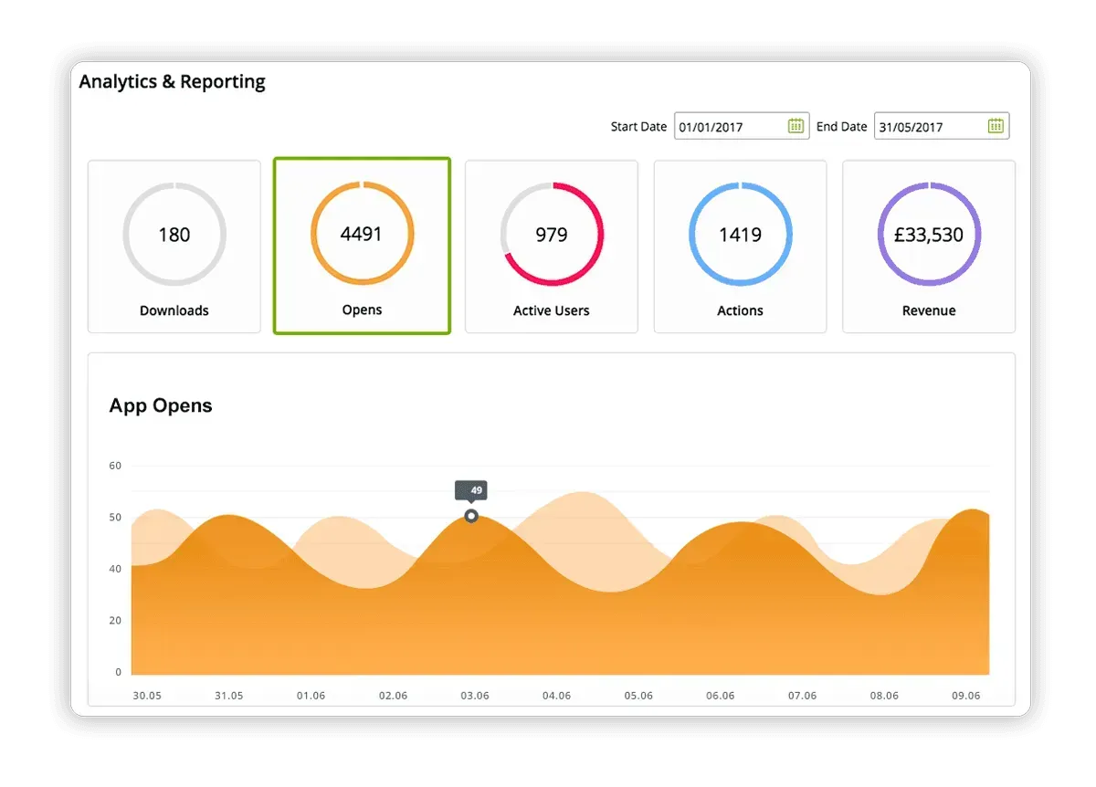 Measure your App success with our built-in analytics tool to track App downloads by device and country or view how many active users you have. You can even connect to Google Analytics for more advanced insights and reporting functionality.